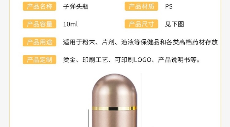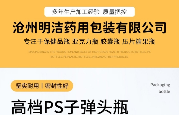 滄州明潔生產(chǎn)銷售10ml亞克力瓶,保健品分裝瓶,子彈頭瓶,鈣片瓶,維生素VC瓶,鈣片咀嚼片分裝瓶,軟膠囊瓶,壓片糖果瓶,中藥丸瓶,避光塑料瓶,固體片劑瓶,塑料藥瓶,產(chǎn)品規(guī)格多,外觀新穎,彰顯大氣。